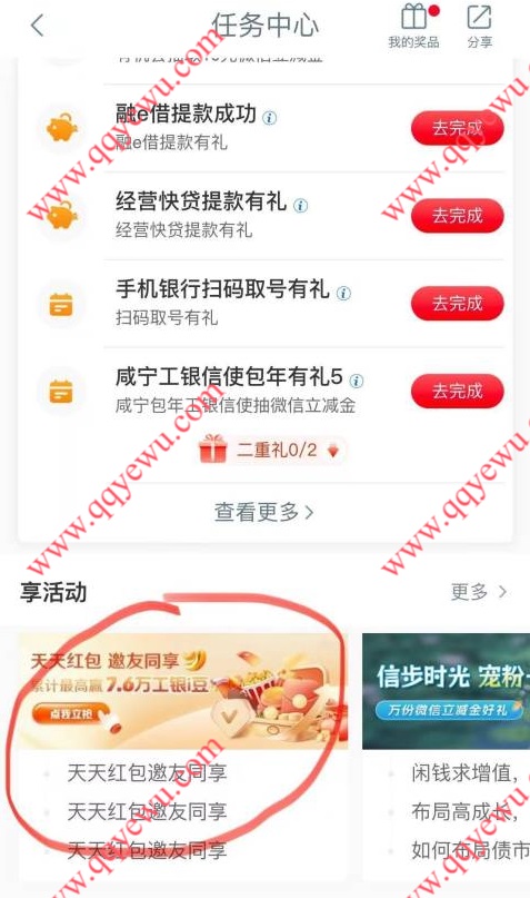打开工商银行APP顶部搜索【任务中心】进去下拉享活动里【天天红包邀友同享】参与