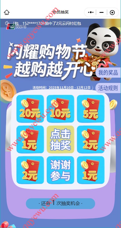 云闪付闪耀购物节抽1-20元云闪付红包,登陆后可以直接抽奖1次,抽到红包需要手动领取