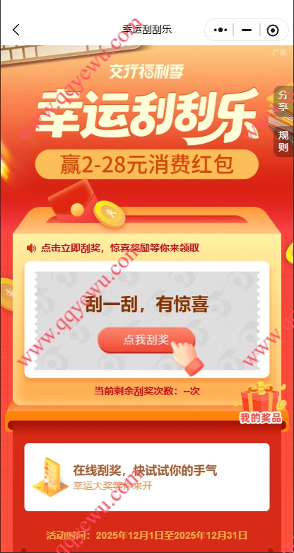 交行幸运刮刮乐必中2-28元支付券红包,进入活动后点中间图片【幸运刮刮乐】报名抽奖。