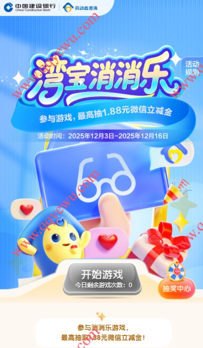 建行劳动者港湾湾宝消消乐抽1.88元微信立减金,通过3关就可以抽奖了,抽到立减金即可领取。