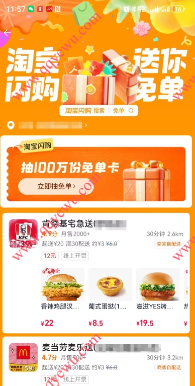 淘宝闪购每天抽100万份免单卡,活动期间都可以参与。