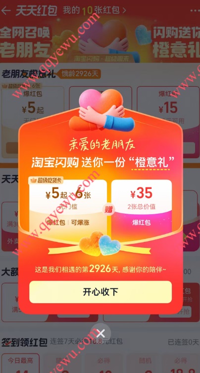 淘宝闪购橙意礼免费领6张5元无门槛红包