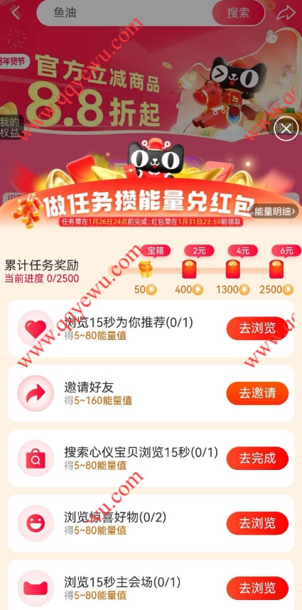 淘宝年货节做任务攒能量领18.2元无门槛红包,号多可多撸,完成指定任务获得能量,累积达到50、400、1300、2500能量值可以分别领到0.2元、2元、4元、6元无门槛红包。