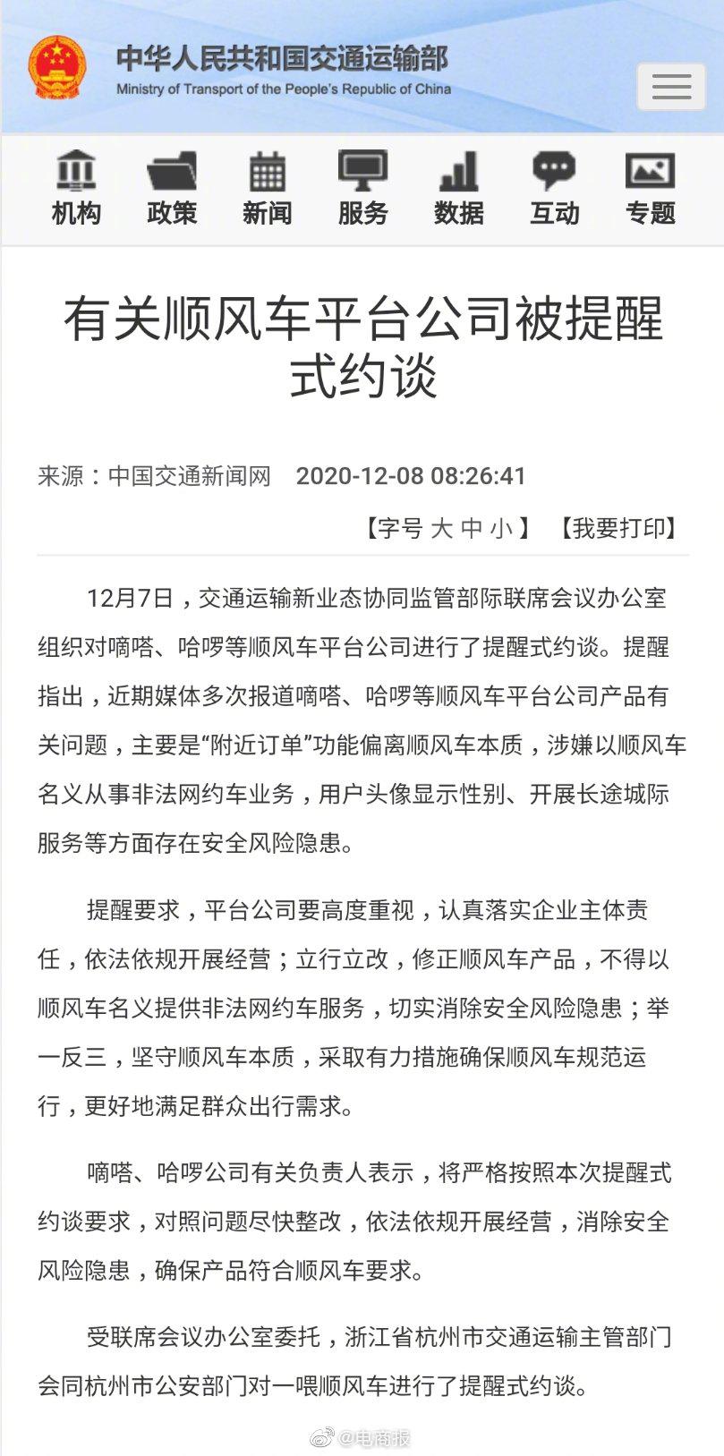 【#嘀嗒哈啰等顺风车平台公司被约谈#】12月7日,嘀嗒、哈啰等顺风车平台公司被提醒式约谈。提醒指出,“附近订单”功能偏离顺风车本质,涉嫌以顺风车名义从事非法网约车业务,用户头像显示性别、开展长途城际服务等方面存在安全风险隐患。