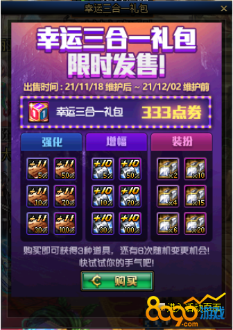 开启后,可以获得1个[幸运]+11装备强化券神秘礼盒、1个[幸运]+10装增帽券神秘礼盒、1个[幸运]次元玄晶碎片神秘礼盒和6个[幸运]道具随机变更券。